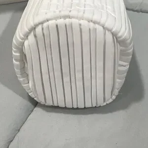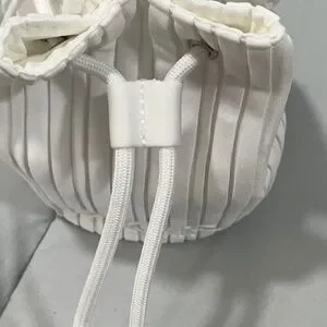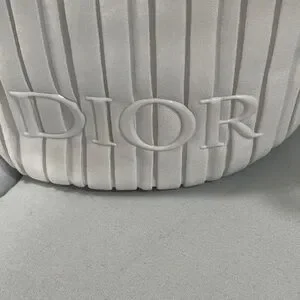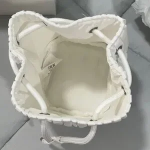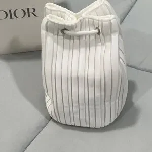 This Dior cosmetic case is crafted in a pristine white hue, featuring a sophisticated pleated design that exudes elegance. Its structured form is enhanced by a drawstring closure, offering both style and functionality for organizing your beauty essentials. The monochromatic color scheme adds a touch of luxury to this essential accessory.