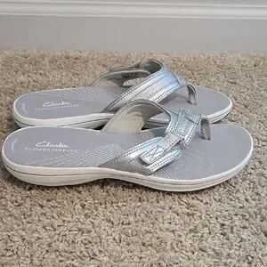 Comfortable Clarks flip flops in silver with metallic finish. Heel height 1.25".