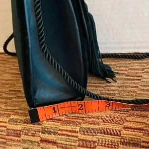 This sophisticated green clutch features a luxurious velvet texture and a distinctive tassel detail, making it a standout accessory for any formal occasion. Its compact size and elegant design ensure it complements a variety of outfits, adding a touch of vintage-inspired glamour.