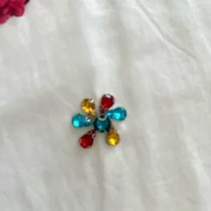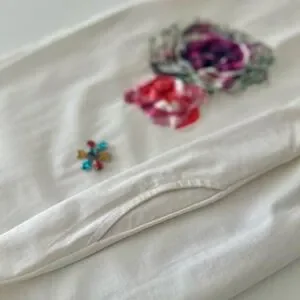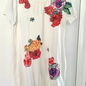 White dress with vibrant satin floral appliqué and floral stones. Features red, pink, orange and yellow flowers. Can be worn as tunic or short dress