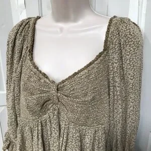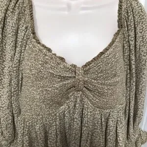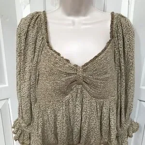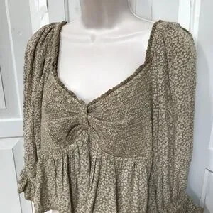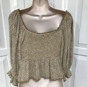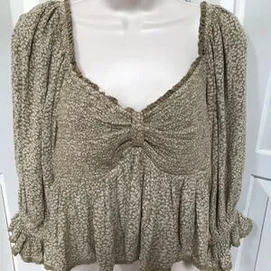 Cute Free People crop top with floral pattern. Features puff 3/4 sleeves and smocked stretchy bust and back. Perfect for casual outings.