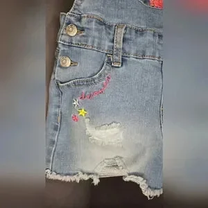 Jordache Girls Sequin Shortall will quickly become every little girls new favorite go-to. Made in a stretch denim fabric for the right amount of comfort and will pair well with any top she chooses. Adjustable straps for an easy fit and functional pockets to hold everything she needs. Constructed in a medium wash denim with sequin appliques and destruction details for a fun look.