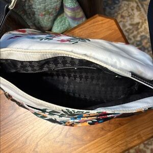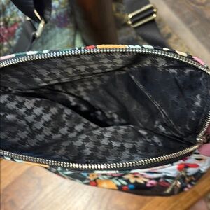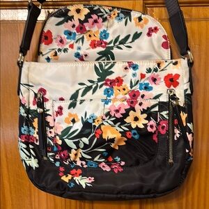 Stylish Karl Lagerfeld bag featuring a vibrant floral design. The black and cream colors make it versatile for any outfit. Has a magnetized fold over design with one large zip compartment and another large compartment under the flap. Also has one interior zip pocket, and two outside small zip pockets with a pocket in between.