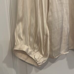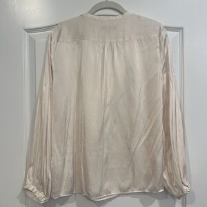 Pretty cream colored blouse with slightly puffed sleeves, pleats down top shoulders on front and sleeve. 4 buttons and tie on front. Button at bottom of sleeves. 100% polyester.