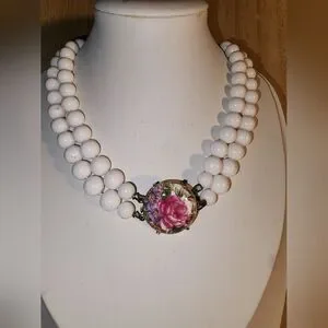 At the heart of this necklace is a breathtaking porcelain floral clasp, delicately hand-painted with a vivid pink rose surrounded by soft green leaves and complementary floral accents. This elegant centerpiece, set in an ornate antique-style metal frame, not only adds a touch of romance but also allows the necklace to be worn with the clasp at the front as a focal point or discreetly at the back.