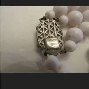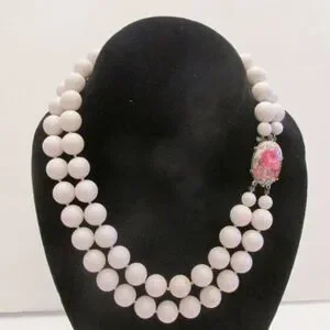 This stunning vintage Japanese two-strand faux pearl necklace is a true testament to timeless elegance and classic beauty. Measuring 16 inches, this exquisite piece features two rows of lustrous white faux pearls, each meticulously arranged to create a gracefully draped silhouette.