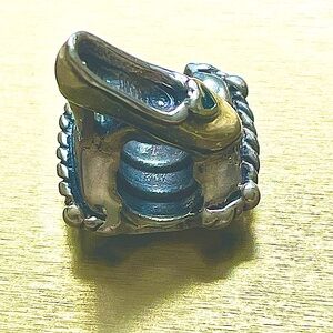 This is a Disney Parks Cinderella shoe charm sitting on a pillow, .925 sterling silver. This charm was purchased at Disney World in 2012. This charm fits Pandora bracelets but it is NOT a Pandora charm.
