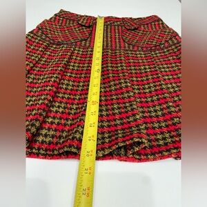 The garment in the images is a skirt with a houndstooth pattern in red, black, and gold, featuring a high waist and two front pockets with black trim. The fabric appears to be a textured wool or wool-blend, which aligns with Vivienne Tam’s style of creating structured, statement pieces often inspired by her cultural heritage. The lining of the skirt, visible in the first image, is black, suggesting a focus on quality finishing, typical of her designs.