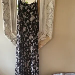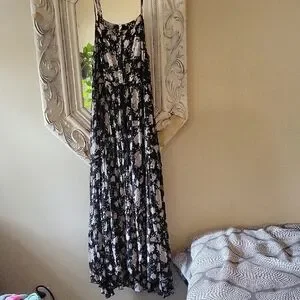 Spell gypsy dancer floral maxi dress perfect for any occasion. Features a beautiful black with white and cream colored flowers. Very flowy, soft! Has a drawstring tie at the waist to adjust the fit you'd like. Straps are also adjustable. Working buttons at the top (works great if you're nursing but wanna be cute!). Lined half-way down. I'm 5'2" and the back drags on the ground.