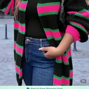 Stay cozy and stylish with this striped women's sweater. Featuring bold black, pink, and green colors, this sweater is perfect for any casual outing. Enjoy the comfort and warmth it provides.
