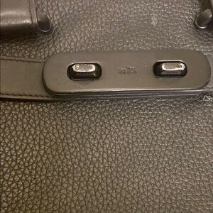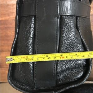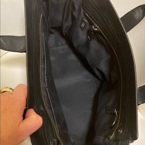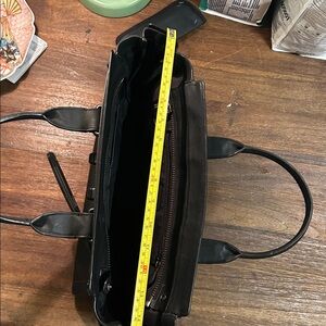 Chic black leather handbag with sturdy handles. Perfect for any occasion. Pre owned, good condition