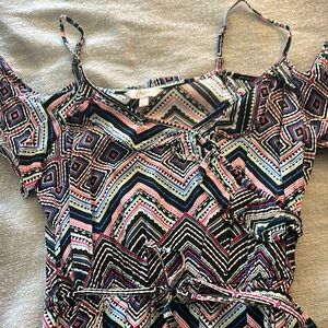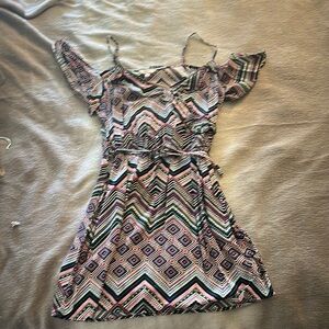 This stylish dress features a vibrant geometric pattern in pink, blue, and black. Perfect for any occasion, it offers both comfort and style.