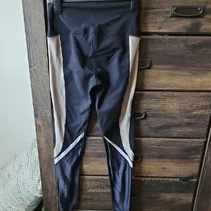 Sleek black leggings with white & gold accents. High-waisted design. Perfect for yoga or casual wear.