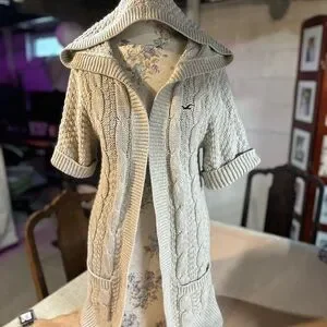 Cream/grey open cardigan with pockets and a hood. Short sleeve! EUC. Pet friendly home