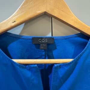 This casual sundress from COS features a sleeveless halter neckline and a ruffled, tiered design in a vibrant blue hue. The dress is perfect for a relaxed day out, offering a comfortable fit with its flowing maxi length and stylish tiered details.