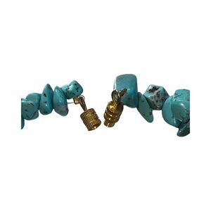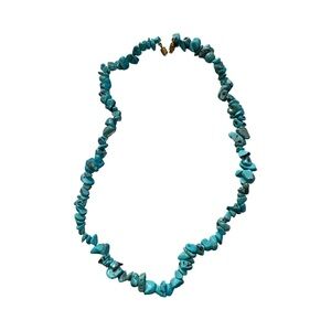 a turquoise nugget necklace. Turquoise is a blue-to-green mineral valued as a gemstone. It is often used in jewelry, particularly in Native American designs, and is sometimes referred to as the "sky stone". The necklace in the image appears to be made of irregularly shaped turquoise pieces, also known as nuggets or chips, strung together. Turquoise is formed through a process involving water seeping through rocks and reacting with minerals such as copper and aluminum. This process often occurs in arid climates and regions with volcanic activity or copper-rich areas. Turquoise is considered a semi-precious stone and has been used for centuries in various cultures for jewelry and ornamentation. It is believed to have protective and healing properties, and it symbolizes wisdom and nobility.