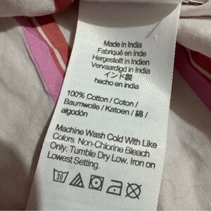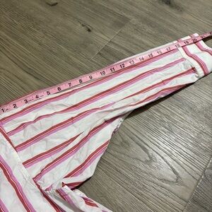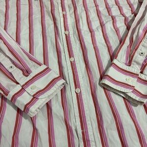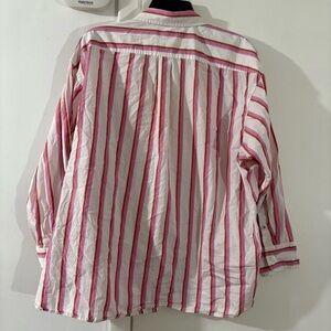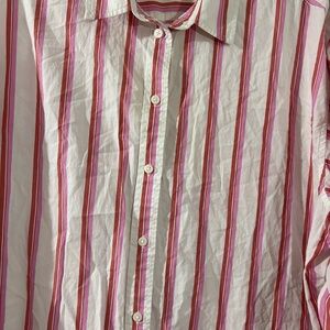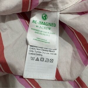 This J.Crew Poplin Shirt Top is a versatile addition to any wardrobe. The relaxed fit and long sleeves make it comfortable to wear for any occasion, whether it be travel, a party or cocktail event, casual outing, or business meeting. The shirt features a pink and white striped pattern, a collared neckline, and a button closure.
