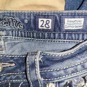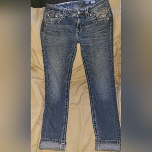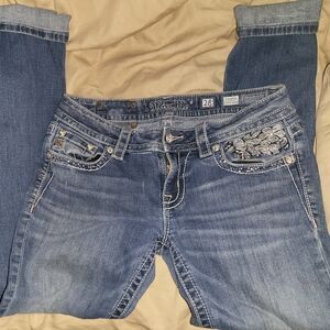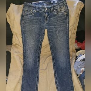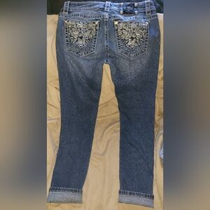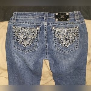 Stylish blue jeans with intricate embellishments on the back pockets. Perfect for adding a touch of elegance to your casual wardrobe. miss me size 28.