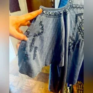 Stylish cotton light blue cold shoulder top with intricate embellishments. Perfect for adding a touch of elegance to your wardrobe. Minimum offer $13.