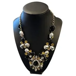 This stunning statement necklace features bold black and gold tones, perfect for adding a touch of elegance to any outfit.