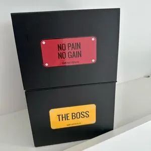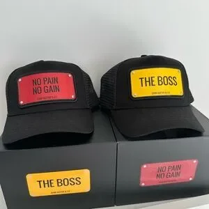 Stylish black caps by featuring bold red and yellow designs. Perfect for adding a statement to any outfit.