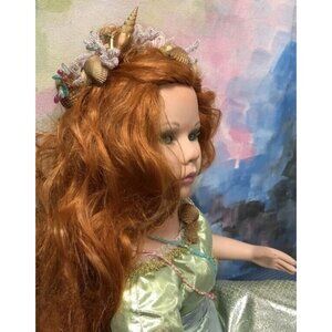 This life-size Fantasia doll by Florence Maranuk is a rare and special edition piece from ShowStoppers Ltd. The doll stands at 62 inches and features red curly hair, green eyes, and a medium-light complexion. The handmade and hand-painted doll is a realistic and poseable mermaid character, perfect for collectors and fans of fantasy themes.