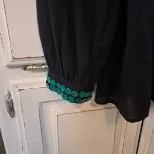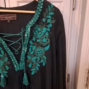 This stylish tunic from Double D Ranch showcases a black base adorned with intricate turquoise embroidery in a V-shaped design at the neckline. The long sleeves and tie front add a touch of elegance, making it a versatile choice for various occasions. With its relaxed fit, this top effortlessly combines comfort and style.