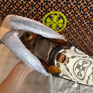 Tory Burch T Monogram Grommet Mini Tote Bag Crossbody Ivory Tan Brown Gold