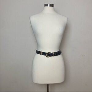 Faux Leather belt reminiscent of Hermes. Goldtone buckle and keeper with 4 “H” initials on embossed faux alligator belt. 34 & 1/2” long; 2” buckle; 5 holes; 1” wide. Vintage belt, rarely worn in excellent pristine condition.