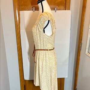 This cream mini sundress features a scoop neckline and a sleeveless design, perfect for casual outings. Its light and flowy fabric ensures comfort in warm weather, while the contrasting brown belt adds a stylish touch.