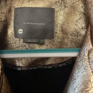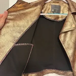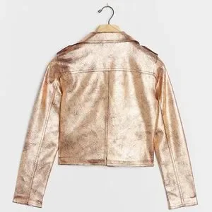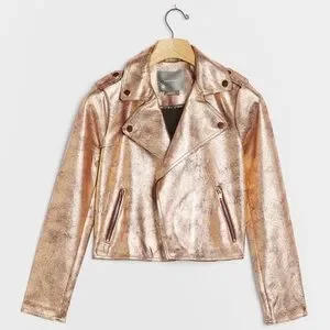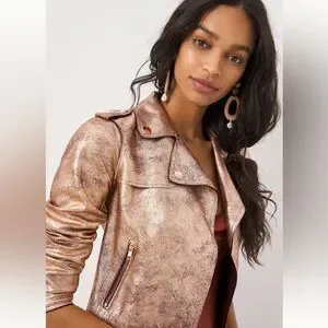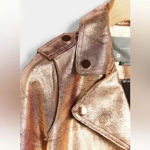 This Anthropologie leather jacket in a striking gold hue combines the classic motorcycle style with a modern metallic finish. Its cropped silhouette and distressed texture offer a vintage appeal, making it a standout piece in any wardrobe.