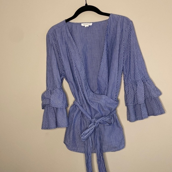 Beach lunch lounge collection 100% cotton made in India size medium. Faux wrap shirt with wrap around for waist. Ruffle sleeves. Pinstripe blue and white. Machine wash. Measurements included in photos. Sleeves are 3/4 length. Pet friendly smoke free home. No stains, tears or holes.