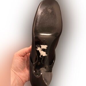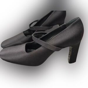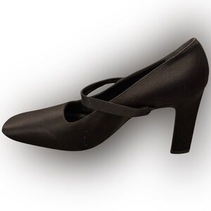 These are gorgeous! Satin (or silk?) Maryjane silhouette pump with approx 3.75in heel. See pics, lots of life left but they need a new heel cap on one shoe, and there are some minor scuffs, some residue on sole and they may benefit from a pro cleaning. So pretty and quite comfortable although I wear a US 10 and they are a bit too snug on me. Price reflects condition 🙂