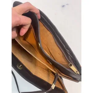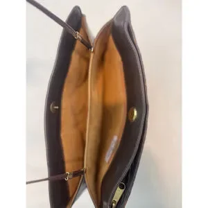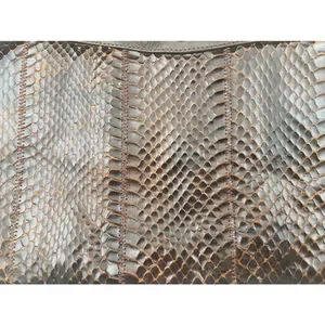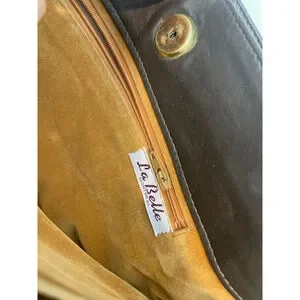 This is a pre-owned La Belle Montreal handbag. The exterior is brown snakeskin. It features a magnetic closure and a thin shoulder strap. The interior is lined with a gold-colored fabric and includes a zippered pocket. The hardware shows some tarnishing. The bag measures approximately 9 inches in length and 6 inches in height. There are some signs of wear on the edges.