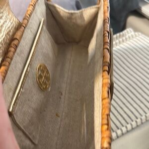 Stylish woven clutch featuring a prominent gold Tory Burch logo. Perfect for any occasion.