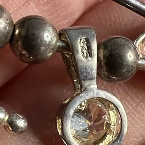 Charming silver brooch featuring green and red gemstones. Unique design with heart detail.