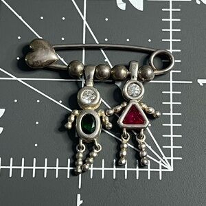 Vintage Sterling Silver 925 2 Children on Heart Safety Pin Brooch Boy Girl Boy