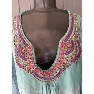 Hale Bob S Cabana Silk Ombre Tie Dye Beaded V-Neck Top Drawstring Waist 37” Bust