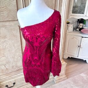Glamour meets sophistication in this stunning one-shoulder, long-sleeve dress! The sleek silhouette hugs your curves, while the asymmetrical neckline adds a bold, modern flair. Shimmering sequin accents catch the light, making you the star of any cocktail party or evening event. Perfectly chic, this dress is ready to dazzle at your next special occasion! New Without Tag. Mint/Excellent Condition. Brand New/Never Worn.