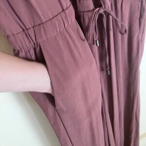 Perfect for summer events and weddings! Generous elastic waist band with tie, pockets, and a V-neck wrap top. Wide legs hit about mid calf. Material is fairly heavyweight and has a crepe-like texture. Color is a salmon/rust red/brown.