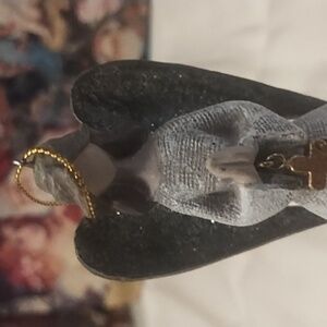 Ceramic angel ornament with the word grace written in cursive on the front of her dress. She has praying hands with a gold tone cross hanging down. lightly loved with no defects