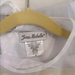Charming dress with a floral top and layered blue tulle skirt. Features a pink bow accent. Girls size 6