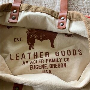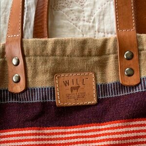 This stylish striped canvas tote bag features vibrant orange, blue, and tan colors. Perfect for everyday use, it combines fashion with functionality. Eugene, Oregon, USA.