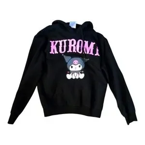 Stylish black hoodie featuring Kuromi design with bold pink lettering. Perfect for casual wear.