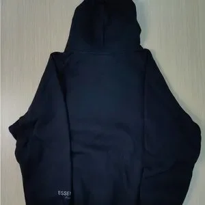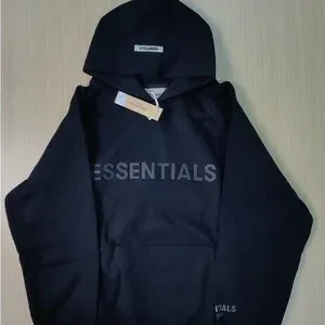 Classic black hoodie with 'ESSENTIALS' branding. Perfect for casual wear.