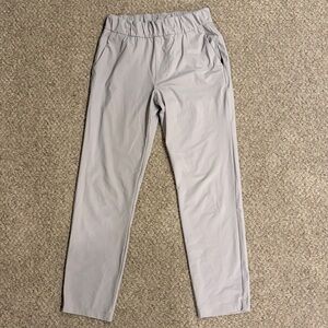 Like new. No stains or flaws. Slightly cropped. Side pockets. Small zipper pocket on the hip. Moisture wicking. Four way stretch. Very light gray (last three photos show accurate color.) Moisture wicking. Four way stretch. Color no longer available.