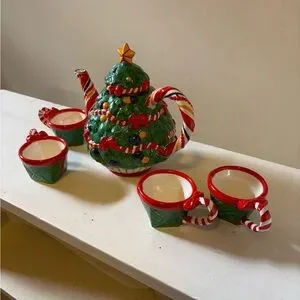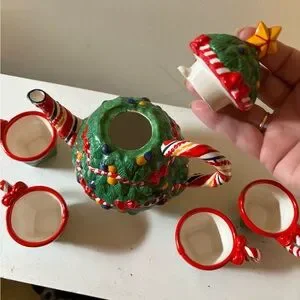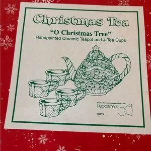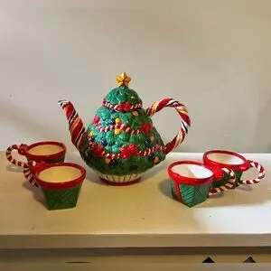 This is a Department 56 Christmas tea set, "O Christmas Tree".