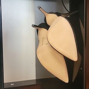 These beautiful shoes are a definite in any women's closet; ready to wear to any red carpet event. The bows are made of rhinestone and really dress up the heel. The shoes stilleto heel measures at 3.5 inches with easy slip-on and slingback strap. These are preowned and have been worn once.
