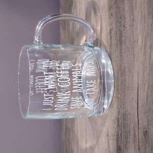 Clear glass coffee mug with white text. "I just want to drink coffee, save animals and take naps." Perfect for coffee lovers.