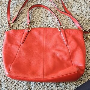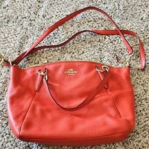 This Coach crossbody bag in vibrant red leather is a perfect blend of style and practicality. Featuring a soft, pebbled texture and elegant gold hardware, it offers a sophisticated look for everyday use. The versatile design includes a comfortable shoulder strap, making it an ideal accessory for any occasion.